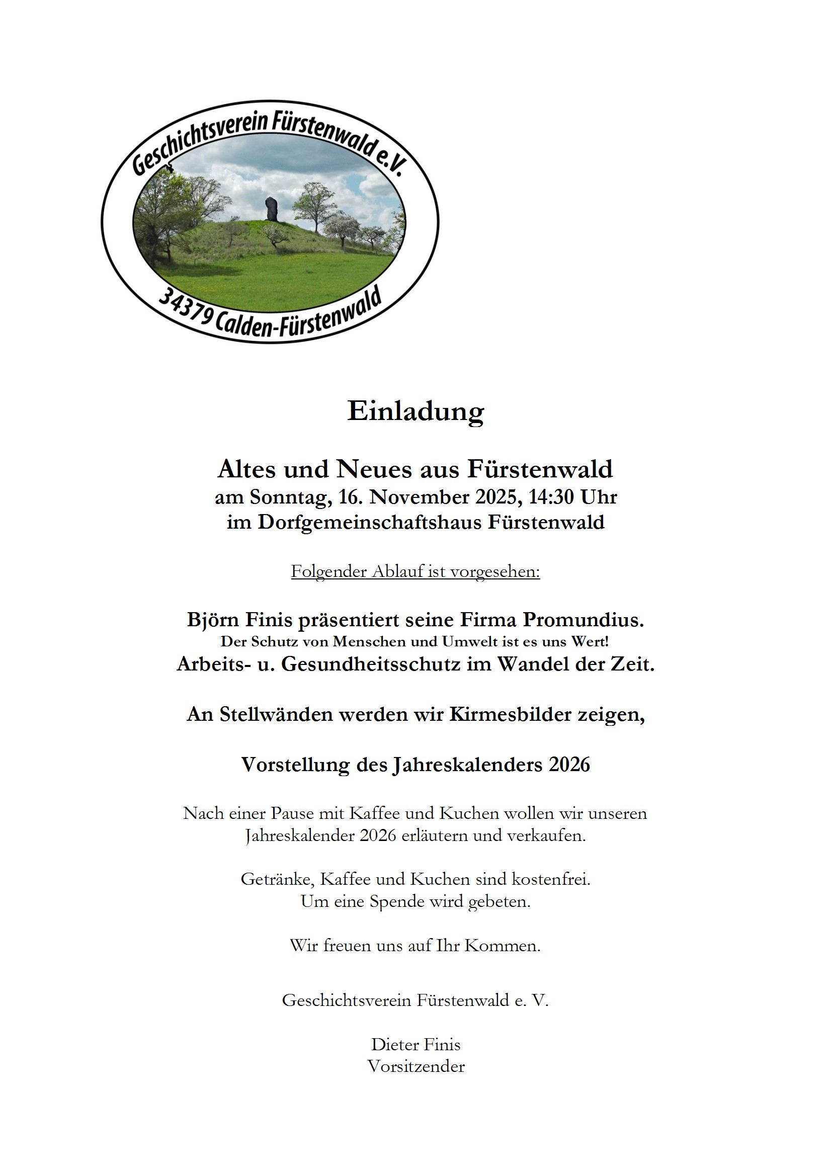 Geschichtsverein So. 16.11.2025 – 14:30 Uhr -Altes und Neues aus Fürstenwald- -Vorstellung des Jahreskalenders 2026-Allgemein, Geschichtsverein