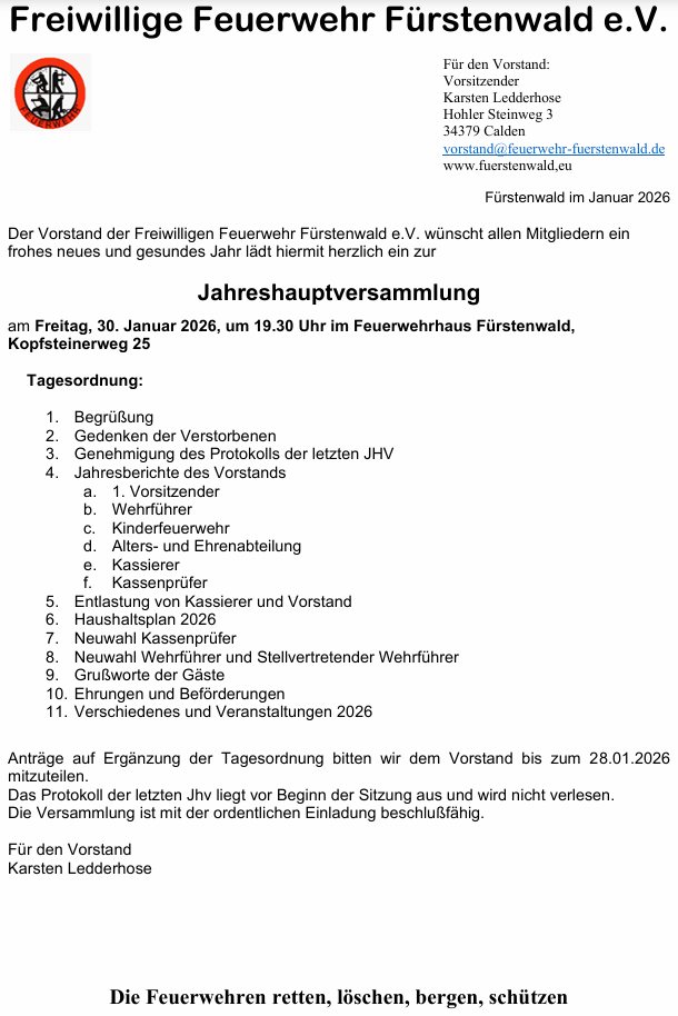30.01.2026 JHV Freiwillige Feuerwehr Fürstenwald 19:30 Uhr